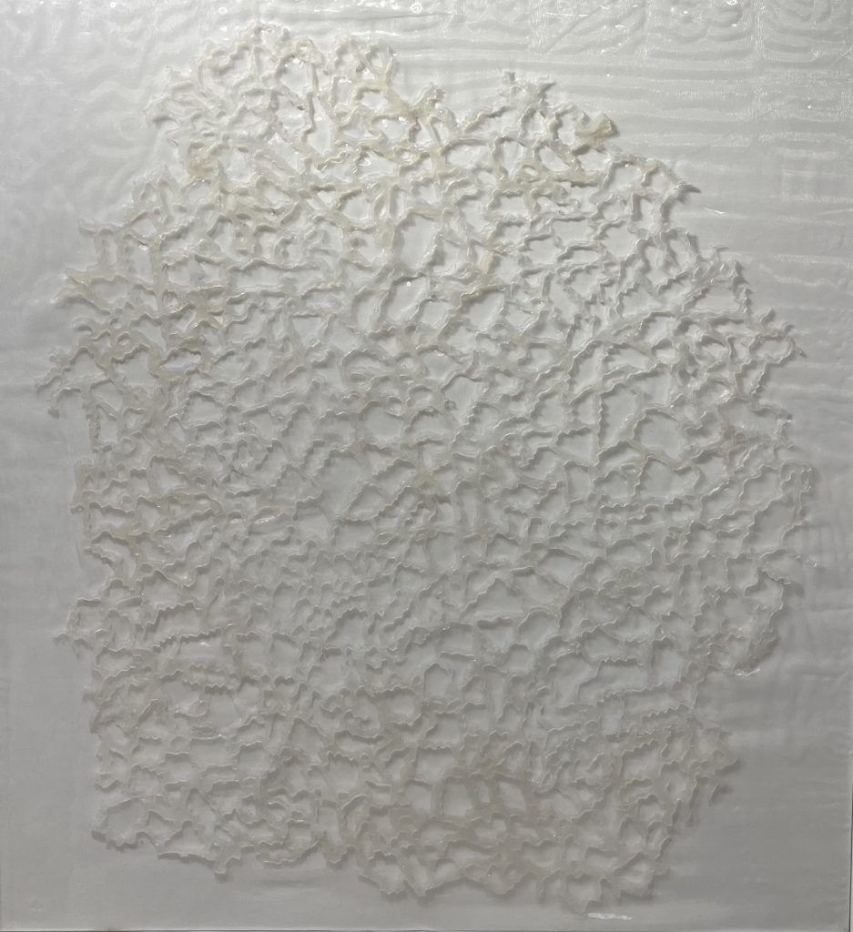 So I went on to make the works in plaster, plastic, paper, silicone, and paint on canvas that comprise this exhibition. I used one work as the start of another, translated forms across materials, and tried different processes – from casting, cutting, tracing, transfer and rubbing, to throwing powdered gouache onto canvas. Besides my liking for process, experiment and materiality, the works continue some of my long-held interests – urban form; organic natural processes; archaeology; and making images from fragments.